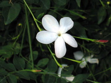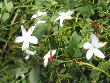 ソケイ(ジャスミン)はモクセイ科の常緑樹である。一般的にジャスミンと呼ばれその芳香が親しまれてきた植物である。亜熱帯性の常緑低木である。樹高は1~4m程度に。葉は奇数羽状複葉で、小葉は卵状楕円形、全縁、鋭頭。花は枝先の葉腋につき、花色は白で、4~5裂した筒状の花をつける。花径は3~4㎝程度。芳香に富む植物である。 | ||