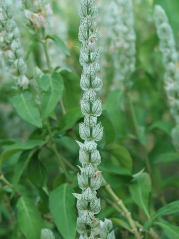 ジャスティシア・ベトニカはキツネノマゴ科の常緑樹である。樹高は1m前後程度に。葉は狭楕円状で茎に対生する。葉の表面には光沢がある。2~4月頃、茎頂に穂状花序を出し、淡紫色の花を多数つける。花そのものは短命だが、白地に緑色の葉脈が浮き出る苞が長く残るので、遠目には白い花が開花しているようにも見える。英名にWhite shrimp plantとあるが、本種は等しく温室栽培される同属で中米原産のコエビソウ(ベロペロネ)の仲間である。 | |