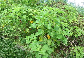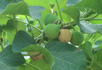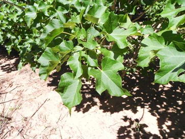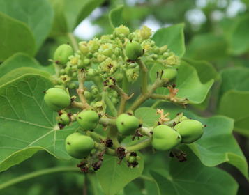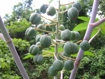 ナンヨウアブラギリは、トウダイグサ科の落葉樹である。名前にはアブラギリとあるが、中国原産のアブラギリとは別属の植物である。樹高は3~8m程度。葉は円状広心臓形で、3~5に浅裂しており、径10cm程度。枝を折ると白い液体が出て来る。その液体も、種子も有毒である。有毒のために、採油を行っても食用には適さない。そこで、近年ディーゼル・エンジン用燃料として注目を浴びている樹木である。 |