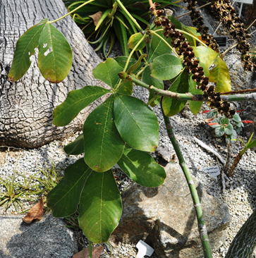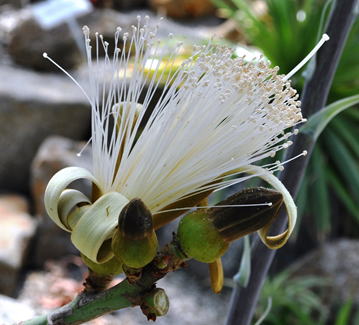 | 解説 | プセウドボンバックス・エリプティクムは、パンヤ科の落葉樹である。幹の基部は肥大化し、樹高は原産地では18m前後にも達するという。葉は卵形で、長い葉柄を持ち掌状に枝につく。新葉の内は赤色であるがやがて濃緑色へと変わる。2月頃、葉の展開に先立って、花冠が退化して、200本前後の雄蕊がむき出しになった花を開花させる。掲載した写真は白色であるが一般的には濃紅桃色である。花の形状から英名ではShaving brush treeと呼ばれる。 | |