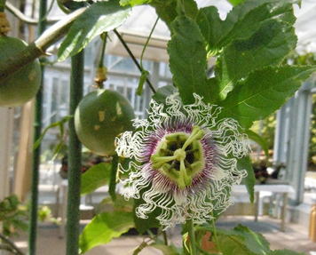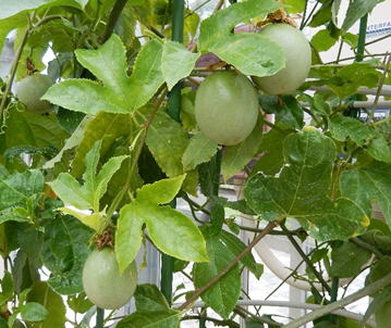 クダモノトケイは、トケイソウ科の蔓性常緑樹である。葉は大きく10~18㎝程度で、葉柄の基部に一対の突起が見られる。花はトケイソウよりやや小さい。糸状になった副花冠の先端がよじれているのが特徴とされる。食用果実として最も適しているのは本種であり、所謂パッション・フルーツと呼ばれているのは本種である。 | |