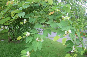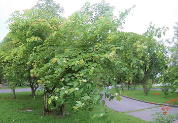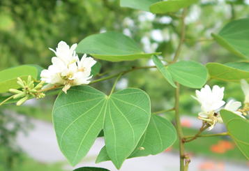 タイ・オーキッドツリーは、マメ科の落葉樹である。本種は、原産地の項に記した地で、標高800までの開けた混合落葉樹林帯に自生する樹種である。樹高は4~6m程度となる。葉は長さ6~10㎝、幅5~9㎝程度の広卵形、先端部で2深裂する。原産地では4~5月頃開花する。枝先の葉腋に散房花序を出し、径8~10㎜程度で白色5弁の花を枝先の葉腋に散形花序を出し、短い花柄を持った径2㎝程度の白花をつける。花後の果実は長さ4~14㎝程度の扁平な莢果で下垂し、3~5個の種子を内包し、熟すと裂開する。 | |