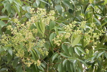 シジギウム・アンティセパティクムはフトモモ科の常緑樹である。本種は、概して東南アジアの沿海地に自生する樹種である。しかし、垂直分布では標高1300mまであり、概して川沿いに自生する。樹高は25~40m程度となる。樹皮は、遠目には我が国の赤松にも似ている様相を停止、赤褐色で、表面には薄い剥離片が目立つ。葉は、長さ7~12㎝程度の卵形で、縁部は全縁、先端部は鋭先形、基部では短い葉柄に連なり枝に対生する。原産地では、3~5月頃開花する。枝先の葉腋に集散花序を出し、白色4弁の花を多数つける。花後には形1㎝程度で白色のほぼ球茎核果をつける。 | |
