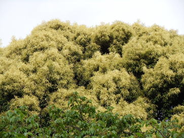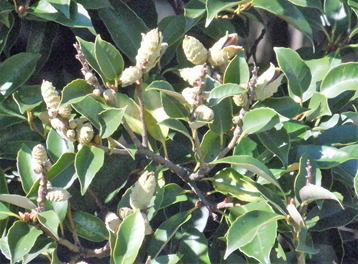 | 解説 | スダジイは、ブナ科の常緑高木である。樹高は20~30m程度に。樹皮は黒褐色で、縦に裂ける。葉は互生し、長楕円状卵形、長さは5~15㎝で、先端は尖る。葉の裏面には灰褐色の鱗毛が密生する。5~6月頃雄花序は、淡黄白色で長さ6~10㎝程度、雌花序は枝の上部につく。開花した翌年の10月頃先端の尖った濃褐色の堅果が熟す。 | |