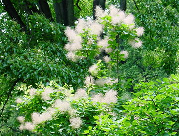 ハグマノキは、ウルシ科の落葉低木である。樹高は3~4m程度に。よく分枝し樹形は自然に円形になる。幹は灰褐色。葉は円形または卵円形で、長さ5㎝程度。6~7月頃、枝先に15~20㎝程度の円錐花序を見せる。花は径3㎜前後の淡緑黄色の小花である。花は、開花後やがて、紫色を帯びてくる。 | |