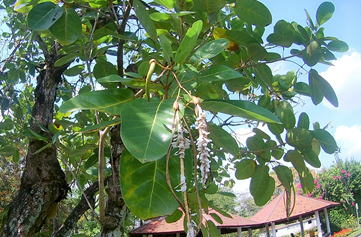 タブベイア・パリダは、ノゼンカズラ科の半落葉樹である。樹高は15m程度となる。葉は長さ8~15㎝程度長楕円形~狭卵形で、3~5個が掌状複葉につき、枝に対生する。花は枝先の総状花序に薄紫色~白色で、長さ5~7㎝程度の通常花をつける。花冠は5裂する。花後には、長さ25㎝程度で直線上の果実を下垂する。 | |