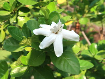 ガーデニア・タイテンシスは、アカネ科の常緑樹である。樹高は4m程度となる。葉は革質で、長さ8~12㎝、幅4~8㎝程度の卵形~倒卵形で、全縁、鋭頭(タイで栽培される場合には円頭となる)、表面には光沢があり濃緑色で枝に対生する。開花時には新梢の葉腋に全開すると径4~8㎝程度の風車形で、5~9個の裂片がある花をつける。開花時には芳香を放つ。 | ||