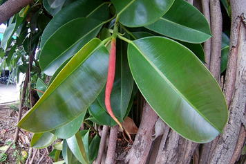 ゴムは、クワ科、トウダイグサ科、キョウチクトウ科、アカテツ科等400種以上の樹木から採取されている。実用的には、トウダイグサ科のパラゴムノキが主要樹種といえる。我が国でゴムノキと称して観賞用に栽培しているゴムノキの場合、インドゴムノキである。これは、パラゴムノキ等と区別するために原産国の名前を冠したといえる。インドゴムノキはインドやミャンマー、マレーシア等の熱帯降雨林に自生する。大きいものは50メートルを超えると言われる程である。幹からは多数の気根を生じ、やがて、それが支柱根となる。葉は、長さ30㎝程度で、照り葉。 | |