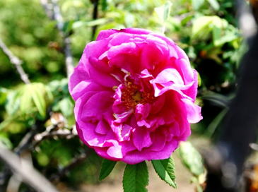 解説 | マイカイはバラ科の落葉樹である。本種は、ハマナスからの八重咲き変種である。樹高は1.5~1.8m程度となる。地下の匍匐枝で繁殖する。茎には褐色の刺がたくさんある。葉は奇数羽状複葉で、皺と毛を持つ。本種は6~8月頃、径7㎝程度で八重咲きの濃赤紫色花をつけ、開花時には芳香を放つ。 | |
