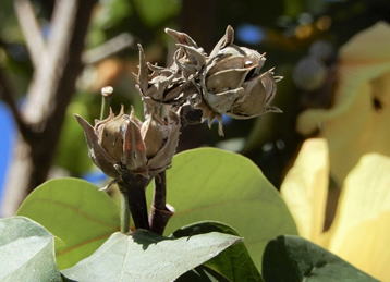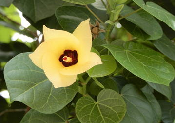 ヤマアサは、アオイ科の常緑高木である。樹高は10m前後程度に。海岸砂地に見られる常緑樹である。葉は長さ10~15㎝程度の円心形で、裏に白い星形状毛が密生し、枝に互生する。花は黄色から午後はややピンクがかる。ハマボウに似ているが大型である。花後の果実は、径5㎜程度の扁球形で、海水に浮き、海を渡る。 | |