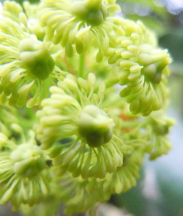 和名は、山に見られる葉が枝先に車状になった樹木の意。 属名は、ギリシャ語のtrochos(=車輪)とdendron(=樹木)の合成語で、雄蕊が子房に車状につくことから。 種小名は「Aralia(=タラノキ属)に似た」の意。 |