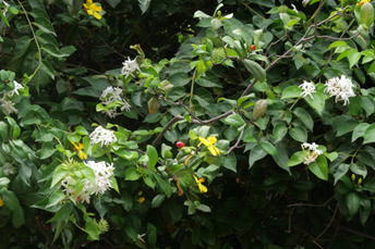 ヤスミヌム・ディコトムムは、モクセイ科の蔓性常緑樹である。樹高は1~2m程度となる。本種は刈り込みに耐え、葉には光沢がある。葉は、長さ5~7㎝程度の楕円形で、枝に対生する。花はほぼ周年開花し、白色で星形の花を夜開する。花は管状で、花冠は5~9裂する。開花時には強い芳香を放つ。花後には、肉質で丸い液果をつけ、2裂する。 | |