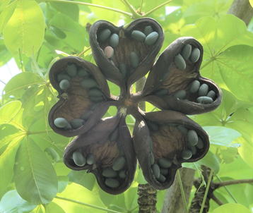 ヤツデアオギリは、アオイ科(←アオギリ科)の常緑樹である。原産地では樹高は最大40mにも達するという。葉は、名前の謂われとなっているようにヤツデに似た形状で、つまり掌形であり5~11裂する。本種の葉は遠目には、等しく我が国で観葉植物として愛培されているパキラにもにている。ただし、パキラに比して、本種の葉はとても柔らかい。花は、総状につき、花の外側は暗赤色で、内側は桃色で濃桃色のストライプが入る。花には、学名にもあるように悪臭がある。種子は黒色に熟し油脂分を多分に含む。 | |