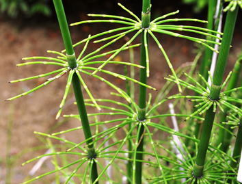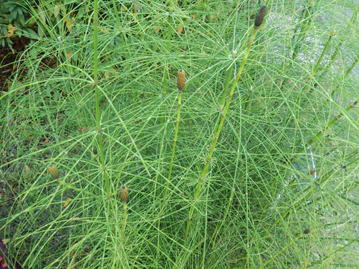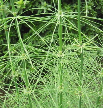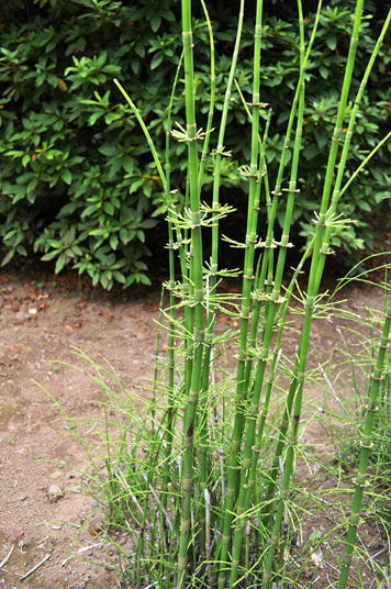 メキシコ・ジャイアントトクサは、トクサ科のシダ植物である。本種は、原産地の項に記した地で高温多湿な地に自生が見られるという。同属の中でも最大級のトクサであり、草丈は8mにも及ぶと言う。本種の属するトクサ属の植物はデボン紀~石炭紀に出現し、地上に林立していた植物の生きた化石と見なされているが、本種はその代表格である。同属にやはり草丈の高いEquisetum giganteumが存在するが、本種よりも草丈は低くなり最大で5m程度と言うことである。また、本種の最大直径が1.8㎝程度であるに対し、Equisetum giganteumの場合には逆に最大直径は2.4㎝程度とより太くなると言う。一見してスギナにも似た風情の草姿を見せるシダ植物である。掲載した写真に見られるように、外見は我が国でも見られるトクサによく似ている。茎は緑色で直立し、中空であり、軟質である。茎の表面には多数の溝がある。本種は、各節毎に輪生状に枝を出す。 | |