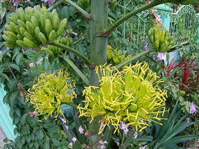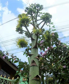 | 解説 | アオノリュウゼツランは、キジカクシ科(←リュウゼツラン科)の大形多年草である。一般的にリュウゼツランと呼ばれている種には葉の縁が黄色い斑で隈取られているが、本種にはそれがない点が特徴とされている。リュウゼンツランの母種と推測されている。開花は十数年に一度と言われている。一度開花した株はその後枯れてしまうという。 | |||