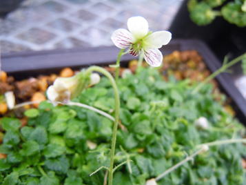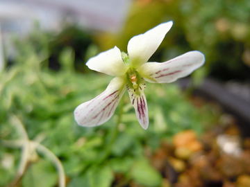 アマミスミレはスミレ科の多年草である。原産地の項に記した地の山地で沢沿いの湿った岩上等に自生する菫である。国内産のスミレとしては最も小さい菫として知られている。根茎は地中を横走し、良く分枝をする。草丈は1〜3p程度となる。葉は長さ5〜7o程度の楕円状卵形〜卵形で、縁部には数個の鈍鋸歯がある。葉には白色の細毛が散生する。4〜5月頃、径1p程度の唇形で白色の花をつける。唇弁には紅紫色の条紋が入る。花茎や萼片には白色の細毛がある。 | |