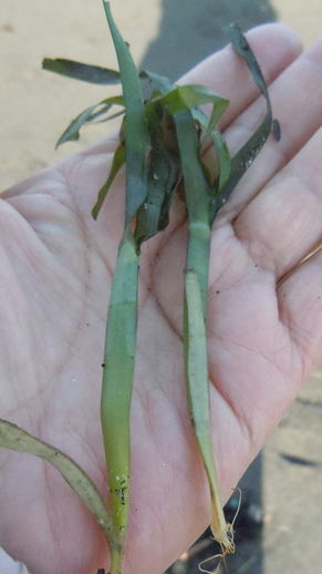 顕花植物の中では珍しく海底植物である。海底の泥土に横に這う根茎から枝を出し、その上方に葉や花序が着く。葉は2列に並び、幅4㎜程度、先は丸く、下部は葉鞘となる。花序は3,4月頃に葉腋から出る扁平な枝の先につき、長い葉状の仏焔苞がある。その下部に雄花と雌花をつける。 | |||