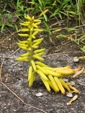 アロエベラは、ツルボラン科(←ユリ科)の多年草である。本種には茎が無いか、或いはとても短い茎しか持たない多肉植物である。草丈は60~100㎝程度に。葉は厚味があり、緑色~灰緑色で、縁には鋸歯状の刺を有する。6~9月頃、1m近い花茎を出し、穂状に黄色い筒状花をつける。 | |||