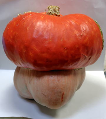 オカメカボチャはウリ科の一年草である。本種はアメリカでジャイアント・パンプキンから作出された園芸品種である。果実の上部は白・緑・オレンジ色の縞模様となり、その基部は緋色となる。大きさは径19~23㎝程度となる。重さは1.3~2.3㎏となる。概して食用ではなく、飾り物として栽培されるカボチャである。 | |