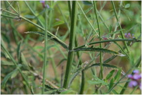 ヤナギハナガサは、クマツヅラ科の多年草である。草丈は1m以上に達する。茎には4~6稜があり、触れると非常にざらつく。茎は上部で多数に分枝する。写真(中)に見られるように葉は、広線形で対生する。葉の縁には鋸歯が見られる。6~9月頃茎頂に5裂した小花の合弁花を紫紅色に多数見せる。 | |