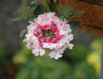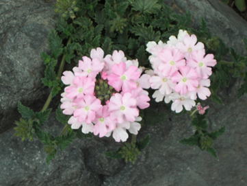 ビジョザクラは、ツマツヅラ科の宿根草または一年草である。現在我が国でバーベナと呼ばれて栽培されているのは、アメリカ大陸原産の数種類の交雑によって得られた園芸品種である。バーベナは、匍匐性のものと立ち性のものとがあり、用途によって使い分けられている。花色も多彩と化している。 | |