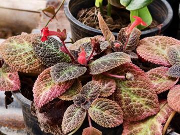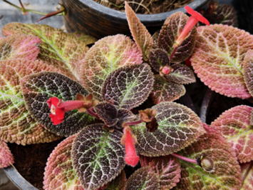 ベニギリソウは、イワタバコ科の多年草である。原産地では、森林地内の地面や岩石上に自生するという。短い茎に楕円状の葉を対生する。葉には鈍鋸歯があり、先端はあまり尖らない。葉腋から匍匐系を伸ばして、その先端に子株を生じる。花は茎上部の葉腋につき、筒状の赤花で、径2~3㎝、花冠は5裂する。 | |