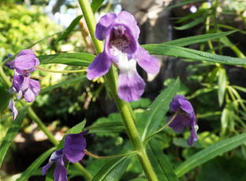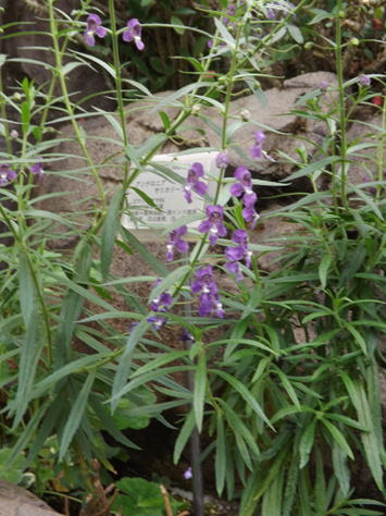 ホソバアンゲロンソウは、オオバコ科(←ゴマノハグサ科)の多年草である。草丈は、1m前後程度に。茎は直立し、分枝を繰り返しながら広がりを見せる。葉は線形に近い披針形で、縁には鋸歯があり、先端は鋭頭、茎に対生する。原産地では周年開花ということであるが、我が国では5~10月頃に葉腋から、長い花柄を持った花を横向きに開く。花色は白、淡桃色、青紫色と多彩。花は、径1㎝前後程度で、喉の部分に白地に斑点模様が入る。花には芳香がある。 | |