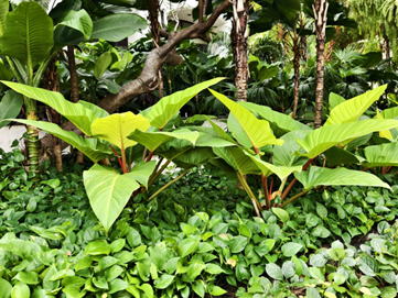 フィロデンドロン 'メラノニー・ゴールド' は、サトイモ科の多年草である。草丈は30㎝前後程度となる。葉は、長い葉柄の先につく長心臓形で、ロゼット状に配置される。若葉は、光沢のあるライム・グリーンで出て、やがて、成長に応じて緑色へと変化する。 | |