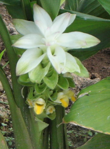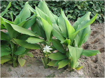 ウコンは、ショウガ科の多年草である。草丈は50㎝前後に。葉姿は長い葉柄を持ちカンナにも似た葉身をつける。葉は基部で交互に抱き合い2方向に数枚出る。葉は表裏共に平滑で、全縁、鋭頭である。8~9月頃抱き合った葉柄の間から花茎を伸ばす。花穂は緑白色~淡桃色の苞葉が重なり合ったもので、実際の花はその下部に見られる黄色い筒状花である。緑白色の花穂を出す。、根茎を煮て乾燥させたものが鬱金粉(ターメリック)であり、胆汁分泌促進役としての効用を有する。また、コショウやシナモン他の香辛料と混ぜてカレー粉を作る。また、根茎の主成分であるククルミンは黄色の色素であり、染料として利用された。ラーメンやタクワンの黄色もこのククルミンから。 | ||