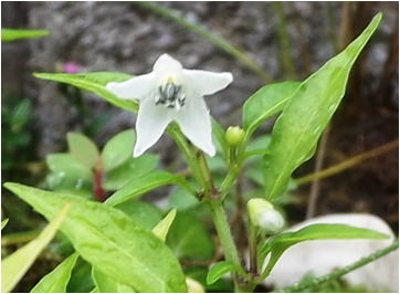 キダチトウガラシはナス科の多年草である。我が国では一年性植物として扱われているが熱帯地方では低木状となり、多年生植物である。ほぼ一年を経過すると幹は木化して、草丈は、1.5m程度になるという。数年を経過すると全くの灌木状になるという。葉は光沢のある披針形で、全縁、鋭頭、基部は葉柄状に細くなる。7~9月頃、枝先に白色5弁の小花をつける。果実は長さ3~5㎝程度の長楕円状で赤熟する。 | |