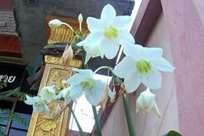 アマゾンユリは、ユリ科の多年草である。花は文字通りの純白であり、芳香も上品で素晴らしい。そのために、結婚式等でコサージュとして用いられる。葉は、一見してギボウシにも似るが、互生する。葉長30㎝程度の 長楕円形、濃緑色で光沢を見せる。花形は 、一見スイセンにも似ている。花径は5~6㎝程度。 |