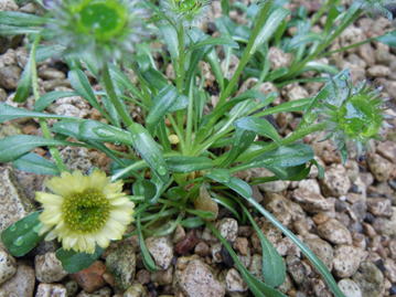 キバナアズマギクは、キク科の多年草である。アメリカ~カナダのロッキー山脈の岩礫地に自生の見られる野草である。草丈は10~20㎝程度。根出葉は長楕円状。7~8月頃に、花茎の頂に写真に見られるような黄色い頭花を見せる。 | ||
