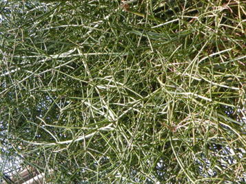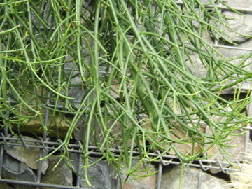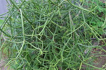 アオサンゴはトウダイグサ科の多肉植物である。写真に見られるように、茎も枝も緑一色の多肉植物である。葉は見られない。枝を折ると白い乳液が出る。その乳液からは石油の代用品が得られることから「石油の木」の名も与えられている。熱帯地方では、草丈が5mにも達するという。 | |