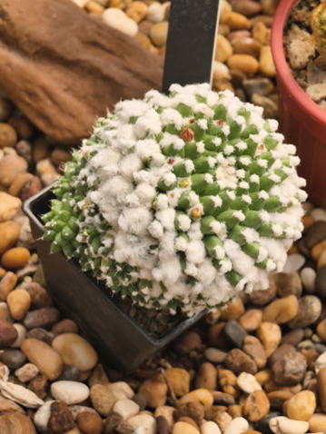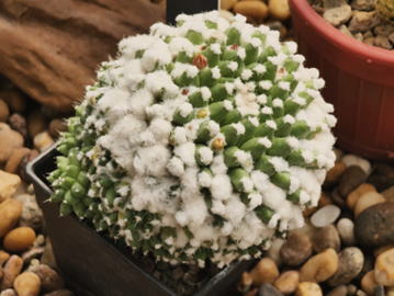 ムゲンジョウは、サボテン科の多年草である。サボテンの中でも、本種は、メキシコ中部の標高100~2700mの高地に広く分布する小型の玉サボテンである。最初は単独で生育するが、後に大きな群落を群落を構成する。結節は4角形で、乳液を含み、葉腋には白色の綿毛を持つ。高さは15~30㎝、直径13㎝程度のほぼ球形となる。放射状の棘は2~5本で、長さ15~45㎜程度で先端は黒色となる。春に開花し、径20~25㎜程度でピンク~白色、中央部は赤色となる。花後には、長さ20㎜程度で棍棒状の果実をつけ、小さな茶色い種子を内包する。 | ||