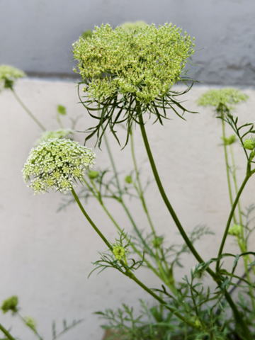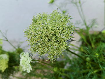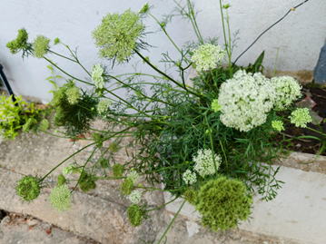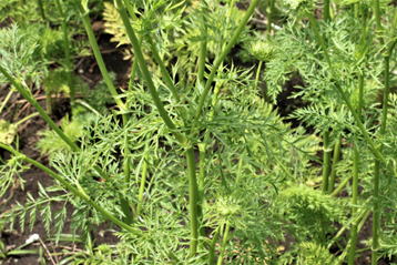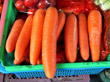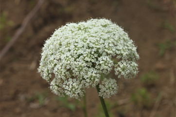 ニンジンはセリ科の1・2年草である。草丈は60㎝前後程度。葉は長柄を持ち羽状複葉で2~3回に裂ける。小葉は卵形~倒卵形でである。7~9月頃、散形花序を出し、掲示した写真に見られるように白色の小花を多数つける。果実は長楕円形で刺を持つ。根部は肥厚した倒円錐形で、短根種と長根種とがあり、色は、橙黄色、黄色、紅色等がある。ビタミンAを多量に含むニンジンは、その初めは薬用として野生種が利用されていたらしい。野菜として利用が始まるのは、10世紀にイラン、バビロニア等で栽培の記録が残されている。欧州系(カロチン・ニンジン)は橙黄色~橙紅色。東洋系(アントシアニン・ニンジン)の場合は濃紫赤色~淡黄色である。Topicsのコーナーに「ニンジンについて」の記述があります。お時間のある方は、そちらを参照下さい。 | |