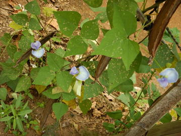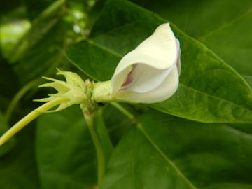 ジュウロクササゲはマメ科の蔓性1年草である。草丈は2~4m程度となる。花は、白~紫色の蝶形花である。真夏に結実するが、莢の長さは30~40㎝程度となる。豆は赤褐色に熟す。 | |