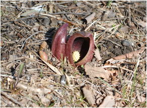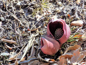 ザゼンソウは、サトイモ科の多年草である。湿地や谷間の陰地に自生し、時として大群落を作る。根生葉はハート形で、その長さは30~40㎝程度。春先に肉厚の仏焔苞を見せる。色は紫褐色であり、その中に肉穂花序がある。雌雄異株。花が終わると、液果は7月頃に熟し、一個の種子が出来る。 | ||