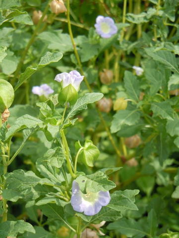 オオセンナリはナス科の1年草である。草丈は1m前後程度に。葉長は5~15cm程度で、先端は鋭頭、縁は大きく切れ込み見せる。7~9月頃、葉腋に淡青色で、径2.5㎝程度の花をつける。実はホオズキに似ているが、毒性を有し食用不可。英名にshoo-fly plantとあるが、本種は、ハエが嫌がる匂いを放つことに因している。そのために、ゴミ捨て場等に植えられることが多い。 | ||