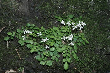 タキミコンロンソウは、滝の傍の急な崖など、地層の隙間から水が滲み出ている岩盤やその周辺の砂利に生育する、アブラナ科タネツケバナ属の多年草である。