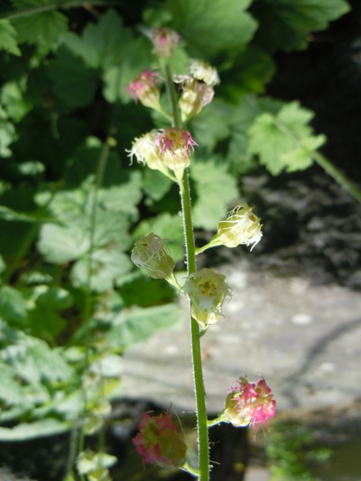 フサカザリは、ユキノシタ科の多年草である。草丈(花茎を除く)は30p程度に。葉は心形で縁は浅裂する。葉の両面並びに葉柄には白色の毛が密生する。特に葉の縁部分には長毛が目立つ。4〜6月頃、60〜80p程度の花茎を伸ばし、穂状花序を出し、径1p程度の筒状花を多数つけ、下方から上方へと咲き上がる。本種の場合、花茎の途中にも葉をつける。花冠は5裂し、さらに各裂片は不規則に5〜7細裂し、先端は糸状となる。花色は開花直後は白色であるが、やがて花色は赤褐色へと変化する。本種の草姿は、一見して我が国に自生するコチャルメルソウ等に似ているという感を受ける。 | |