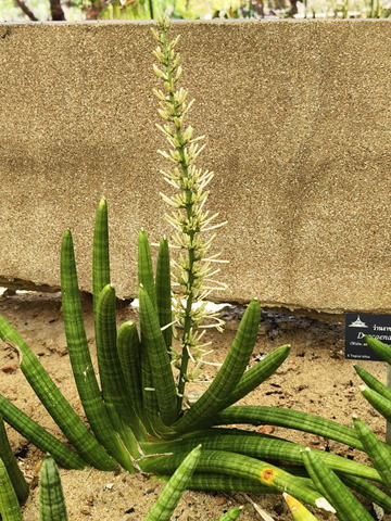 ドラセナ・アンゴレンシスはキジカクシ 科の多年生草本(多肉植物)である。縞模様の細長い滑らかな緑灰色で亜円筒形の葉を持ち、草丈は、2m程度まで成長する。葉の直径は最大3㎝程度までで、葉は全体的に扇形に配置されて成長する。開花時にはロゼットの中央部から花茎を立ち上げ、上部に総状花序を出し、幾分ピンクがかった白色で管状の小花を周囲に多数つける。 | |