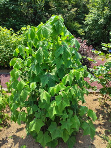 トロロアオイモドキはアオイ科の1年草である。草丈は150㎝前後程度となる。1~2程度に。葉は長さ12㎝前後程度の掌状で5裂、或いはそれ以上に裂ける。6~8月頃、枝先に、径6~10㎝程度で朱赤色、ハイビスカスにも似た花をつける。花は一日花であるが、次々と開花する。 | |