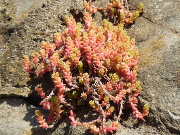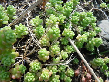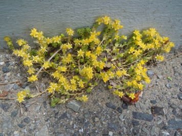 タイトゴメは、ベンケイソウ科の多年草である。概して海岸の岩上や崖などに自生の見られる多年草である。多肉質の茎葉地表を這い、良く分枝し、草丈は5~7㎝程度となる。多肉質の葉は円柱状倒卵形で、長さは3~7㎜、茎に互生する。5~7月頃、集散花序を出し、黄色の小花を多数開く。 | |