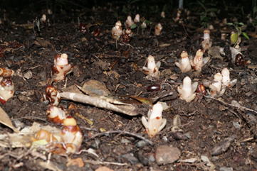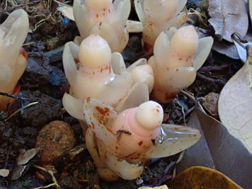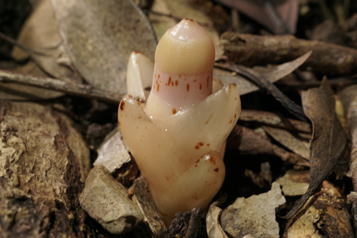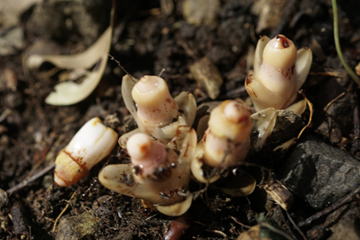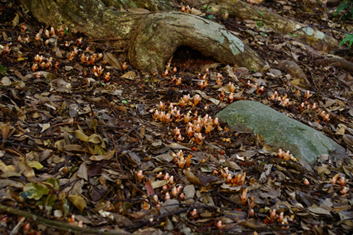 ヤッコソウは、ヤッコソウ科の多年草である。本種は、ナンバンギセルなどと同様に植物体には全く葉緑素を持たず成長に要する栄養は寄生する植物から得る完全寄生植物である。本種は、スダジイ等シイ属の根に寄生し、大群落を作る。草丈は3~7㎝程度の円筒形で、基部は塊状となる。植物体は根の中で生活をし、11月頃に花だけが、奴さんが万歳しているような姿で地表に顔を出す。花の構造は、花弁や葉が無く、雄蕊と雌蕊がある。葉は鱗片状に退化しおり、雄蕊と雌蕊はどちらも筒状で、雄蕊が雌蕊に被さっている。 | ||
